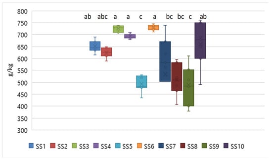 The organic matter amounts in SS were on average 610 g∙kg−1, ranging from 380 (SS9) to 730.3 (SS10) g∙kg−1 (Figure 4). The amounts of OM averaged over the years of the study for SS1, SS2, SS3, SS4, SS6, and SS10 did not differ, similarly to the values found for SS5, SS7, SS8, and SS9. It should be emphasized that the size of the installation did not influence the OM level (no differences between SS representing different installation sizes), which was primarily related to the degree of effectiveness of the SS stabilization processes. Referring to the German guidelines given in the strategy for dealing with municipal SS [] (OM content above 650 g∙kg−1 indicates unstabilized sewage sludge; the content of 650–600 g∙kg−1 organic matter—sludge is poorly stabilized; 600–550 g∙kg−1 organic matter—the sludge is considered stabilized; below 550 g∙kg−1 organic matter—sludge is very well stabilized), the analyzed SS5, SS8, and SS9 were characterized by stabilized organic matter, while the other analyzed SS unfortunately indicated a lack of proper stabilization because of their relatively high OM contents (Figure 3).