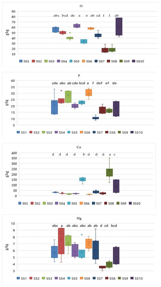 The macronutrient amounts found in SS usually decreased in the following order: N > Ca > P > Mg. As can be seen from the data in Figure 4, the values for individual SS fell within wide ranges; nevertheless, the average values over the years of the study for individual SS indicate that this waste is a valuable source of nutrients. As in the case of organic matter, also with regard to the amount of macronutrients, the size of the installation had no significant impact on the variation in their levels in the SS. This means that SS representing different sizes of WWTPs were not statistically different in each case. Mean content of total nitrogen amounted to 44.3 g∙kg−1, ranging from 13.3 to 78 g∙kg−1. Calcium content averaged 62.3 g∙kg−1, in the range from 9.5 to 350 g∙kg−1. Mean content of phosphorus amounted to 20.7 g∙kg−1, ranging from 8.7 to 34.0 g∙kg−1. Magnesium averaged 5.8 g∙kg−1, with values within the range from 3.0 to 9.3 g∙kg−1 (Figure 4).