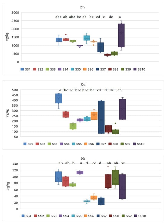 Heavy metal contents in the dry matter of SS from individual WWTPs over the years of the study (Homogeneous groups are indicated by the same letters).