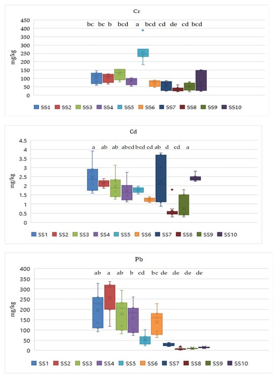 As previously mentioned, the Regulation of the Minister of Environment on the Municipal Sewage Sludge [] specifies the conditions under which SS can be used for environmental purposes. Annex 1 of that Regulation indicates limit values for heavy metals in SS depending on their use. Also, Hudcová et al. [] and Collivignarelli et al. [] in their study emphasized that in most European countries the quantitative level of heavy metals is the most important parameter, next to sanitary pollution, when deciding to use SS for agricultural purposes. As can be seen from the data presented in Figure 5, the amounts of heavy metals in the examined SS varied within wide limits. Nevertheless, the maximum values did not exceed the permissible contents of heavy metals specified in the above-mentioned Regulation, which is advantageous in the context of the agricultural use of SS. Jakubus [] also analyzed the distribution of metals in sewage sludge fractions from Wielkopolska and proved the environmental safety of SS when applied to the soil, which resulted from the presence of metals in less mobile complexes, consequently being less available for plants.