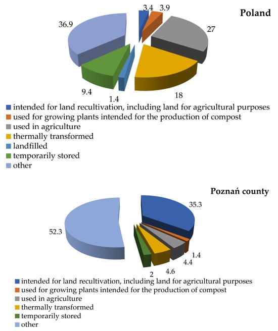 The popularity of methods related to the natural use of SS (for land reclamation, for growing plants intended for compost production, and for agriculture) is not surprising and is justified from the point of view of circular economy and bioeconomy. When we add up the percentage shares for the three methods of SS management (Figure 6), it turns out that on the national scale they account for 34.3%, while in Poznań County it is 41.1%. These approaches to SS utilization are rational and result from the local conditions and the beneficial properties of this type of waste. Moreover, by acting in accordance with the provisions contained in the Regulation of the Minister of Environment on the Municipal Sewage Sludge [] or the Regulation of the Minister of Environment on the R10 recovery process [], we can effectively utilize the fertilizing value of SS. A review by Hudcová et al. [] also indicated that in most EU countries, SS is used for agricultural purposes.