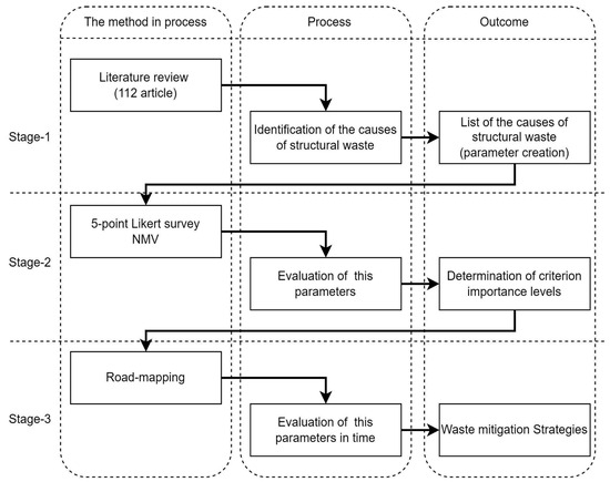 This study aims to determine the root causes of waste in the construction industry and offer comprehensive solution recommendations that take a holistic approach to the analysis and integration of time. The general framework of the study consists of three stages. Figure 1 provides an overview of the process proposed for this study.