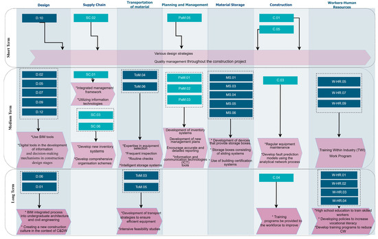 Although many studies have been carried out in the literature to solve the criteria causing CW, the roadmap method has never been used in this field before. Mapping is necessary to determine various criteria to make short-, medium- and long-term plans for the solution. According to the former studies in the literature, the construction sector has been highly affected after the COVID-19 pandemic, and new findings have emerged in CW causes after COVID-19 [59]. Solving these emerging criteria as a priority and preventing the spread of these causes that cause CW are seen as the first parameters to be solved for CW reduction in this study. It is then considered that parameters of high importance and parameters that have been analyzed in the literature should be solved in the long term. Finally, the time-dependent parameters to be solved must be highlighted.