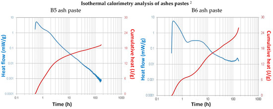 The preliminary results of analyses of the hydraulic activity of eight ash samples from five different thermal processes [45,46,47] confirmed the literature findings. The chemical and mineralogical analyses showed comparable results according to the type of fuel used in the incineration process for each ash, while their mechanical and physical properties (hydraulic activity index and porosity of composites) varied to a greater extent within each group, especially at longer time intervals [32,45]. These results underscore the importance of detailed phase characterization with an emphasis on defining the compositional and structural properties of the amorphous phase. The time interval of exposure to the atmospheric conditions is also an important factor influencing the characteristics of ashes [46,47]. The next study was conducted on two ash types resulting from the same thermal process during coal combustion (labeled B5 and B6). Based on the results of physical, chemical, and mineralogical (Table 1) investigations, the differences between both of the investigated ashes could not be revealed. The differences reflected in the mechano–physical characteristics of both ash pastes (a mixture of ash with water) could only be detected by measuring the heat release (Figure 1) during their hydration (calorimetric analysis).