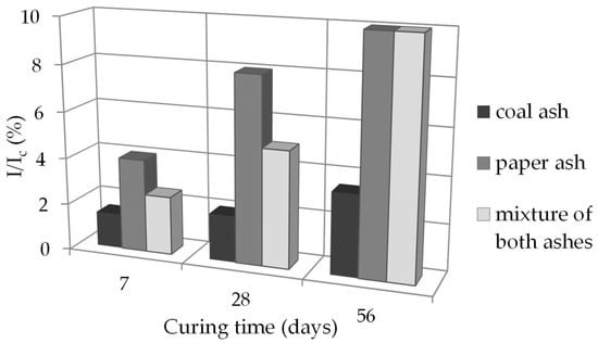 Lime and cement have long been the most commonly used additives for geotechnical composite preparation and waste immobilization. Some of the ashes have similar binding properties as lime and/or cement. The effectiveness of replacing the lime/cement with appropriate ash was confirmed by research work in which we used ash from the incineration of paper sludge for the remediation of contaminated soil [9] and good practices of the usage of paper ash for the environmentally acceptable composites from different non-hazardous and hazardous waste materials with the required mechanical properties [8,46]. Investigations of different ashes have shown that the reactivity of less active ashes can be increased by adding another suitable type of ash to the system. Figure 2 shows the quantity of hydration products formed during the hydration of less reactive ash (coal ash), more reactive ash (paper ash), and a combination of both. The amount of hydration products formed during the hydration over time confirms the reactivation of less reactive ash by blending it with a more reactive one.
