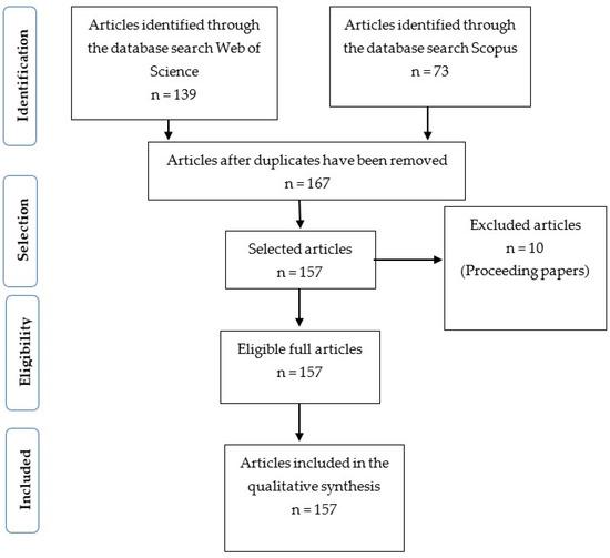 It should be noted that only documents corresponding to scientific articles were included in the outputs, excluding books, proceedings, and other documents. Initially, 139 articles were obtained from the WOS search and 73 from the SCO search. The data collected was downloaded in Bibtex format for later reading in the R Studio software (version 1.2.5042), which was used to eliminate duplicates and create a unified database that resulted in a final output of 157 articles (Figure 1).