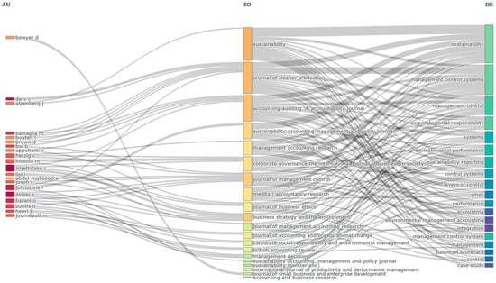 Figure 2 shows, in its first column (AU), the authors who published their research on MCS and sustainability. The principal authors who have worked in this area are Dorothea Maria Bowyer, Charl de Villiers, and Jan Alpenberg. In the center column (SO), we have the journals where these research papers have been published. We can see that the journal with the highest number of publications on this subject is sustainability (21 articles), which is a Quartile 1 journal with h-index 169 and impact factor SJR = 0.67, followed by the Journal of Cleaner Production (17 articles), which is a Quartile 1 journal with h-index 309 and impact factor SJR = 2.06, and the Accounting Auditing and Accountability Journal (10 articles). Finally, the right-hand column (DE) shows the main topics investigated. The most researched topics are sustainability, MCS, management control, and CSR.