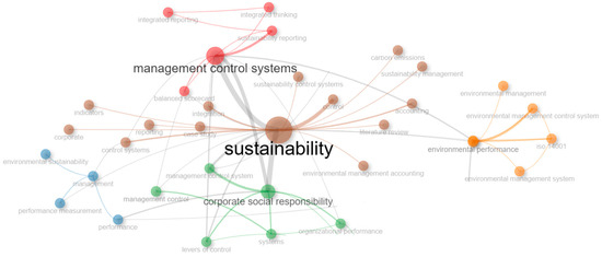 The network linking the research topics allows us to identify several clusters (see Figure 3). One is related to sustainability management (brown cluster). Sustainability management is the process of planning, organizing, directing, and controlling organizational resources to meet the needs of the present without compromising the ability of future generations to meet their own needs. This includes activities such as setting sustainability goals, tracking progress, and identifying opportunities for improvement [73,74,75,76,77]. Another cluster refers to CSR (green cluster), which refers to the business practices undertaken to manage their impact on society and the environment. This can include activities such as donating to charity, reducing pollution, and promoting employee diversity [74,78,79,80]. The red cluster deals with MCS, which acts as a framework that helps assess an organization’s performance against set objectives, monitoring progress, and identifying areas for improvement [46,53,81,82,83]. The cluster that deals with Environmental Management (blue cluster) refers to the process of planning, organizing, directing, and controlling activities to ensure that an organization’s operations do not cause unacceptable environmental damage. This includes activities such as identifying and assessing environmental risks, developing, and implementing environmental controls, and monitoring compliance with environmental regulations [26,84,85,86,87]. Finally, the orange cluster deals with Environmental Management Systems, which are a set of procedures and practices that organizations can use to manage their environmental impact. They can help organizations identify and assess environmental risks, develop and implement environmental controls, and monitor compliance with environmental regulations [82,84,85,86,88].