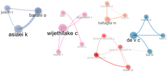 Figure 4 shows the most relevant authors, namely Wijethilake, Asiaei, Battaglia, Villiers, and Abdel-Maksoud, and the network of interconnections between them.
