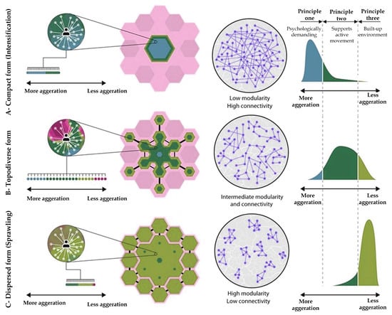 Urban form describes the physical layout, design, and spatial organization [10,38]. It encompasses the arrangement of buildings, streets, open spaces, infrastructure, and land uses within a city, as well as the patterns of connectivity and urban density. Urban form plays a crucial role in shaping cities’ functionality, livability, and sustainability, influencing various aspects of urban life: transportation, land use, social interactions, and quality of life. Different urban forms can result in distinct urban experiences and outcomes, reflecting diverse cultural, historical, economic, and geographical contexts. It fosters urban resilience to various environmental challenges and pressures [51]. For example, compact and mixed-use urban forms promote efficiency and connectivity by minimizing mobility distances between land uses, reducing energy consumption, and fostering social interaction [102,103,104]. Additionally, it supports public transportation networks, reducing reliance on private vehicles and mitigating traffic congestion and air pollution [105,106,107]. Figure 1 illustrates three forces that shape urban forms. The first is the centrifugal force, called urban proliferation, which incorporates fragmented settlements in the city’s periphery or diffused-haphazard buildings characterized by low density with the existing urban masses [108,109]. The second is the centripetal force, called “compactness forces” or monocentric high-density development, which intensifies built-up areas through infill development, reusing brownfields, and replacing existing buildings with new ones [104,110,111]. The hybrid force, also known as the topo-diverse form, is the last [112]. The topo-diverse city, as envisioned by Samuelsson, represents an urban form that adheres to these principles. It is characterized by a macroscale polycentric structure, balancing spatial containment and urban sprawl. This form supports active movement and psychological restoration, providing a variety of environments that cater to different needs and preferences.
