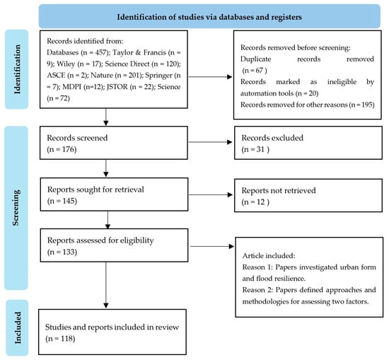 Despite the significance of urban forms, debates about the most influential urban form in FR have arisen [50]. Some studies have regarded the compact form as a symbol of modern urban planning; at the same time, recent discussions have focused on whether this form is ideal for FR. A compact urban form may expose many assets and lives to risk due to the higher concentration of runoff volume in a limited area. On the other hand, higher population densities and mixed land use can minimize urban sprawl, leaving more open space for runoff absorption [51]. Some scholars present several counterarguments that increasingly intense and unpredictable rainfall patterns can overwhelm even the most well-designed urban form strategies, making them less effective at flood reduction. Additionally, retrofitting cities and modifying urban forms to prioritize flood reduction may lead to sophisticated consequences, such as increased traffic congestion or reduced housing affordability. All previous discussions raised the necessity of assessing the trade-offs between urban form and FR in alignment with broader efforts in disaster risk reduction. Therefore, our main research question is: What are the critical urban form characteristics at different scales that enhance FR? And why have divergent opinions been raised about the effectiveness of urban forms on FR? Consequently, a systematic review was conducted using nine scientific database engines to find peer-reviewed articles and classify them using the PRISMA method. Studying this point is a critical research area with far-reaching implications, in addition to combining several disciplines (urban planning, environmental management, disaster risk reduction, etc.) that add scientific value to the disaster management field.