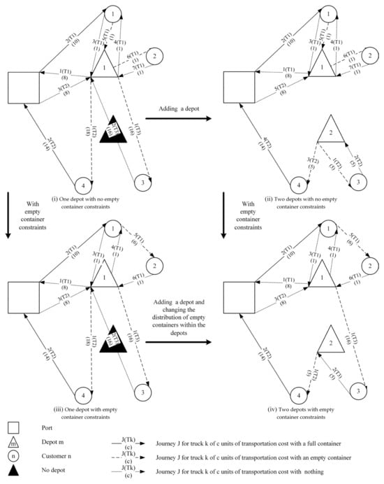 In order to develop an intuitive understanding of the disparities arising from empty container constraints across multiple inland depots, a simplified instance was introduced, as shown in Figure 1. This instance took one shift of the planning horizon (8 h) as an example and defined 10 min as one unit of time; thus, one shift contained 48 units of time. The traveling and waiting costs were measured in units of time and were assumed to be equal per unit of time. There was one port, one (two) depot, and four customers, and each customer had one task to be handled. Customer 1 was a consignee who needed a full container to be delivered and the emptied container to be picked up. Customers 2–4 were shippers. Customer 2 and customer 3 each needed an empty container to be delivered, while customer 4 needed an empty container to be delivered and the loaded container to be picked up. We assumed that the time cost required for loading (unloading) a container to (from) a truck was 1 unit (10 min) and that the time cost for packing or unpacking a container was 6 units (60 min). The numbers without parentheses on the arrow lines indicate the sequence of truck movements, while the numbers within parentheses on the arrow lines denote the corresponding transportation costs in terms of units of time. Figure 1 and Table 1 show feasible truck dispatching and route planning for four different real-world scenarios: (i) one depot with no empty container constraints, (ii) two depots with no empty container constraints, (iii) one depot with empty container constraints, and (iv) two depots with empty container constraints.