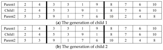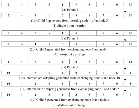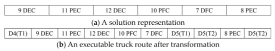 Furthermore, in light of the multifaceted considerations within this study, including two operation modes (Strip and Discharge), coupled with two strategies for relocating empty containers (Street-turn and Depot-turn), it became inherently challenging to accurately anticipate the length of an individual route. Therefore, a new approach was employed to solution representation, as advocated by Yang et al. [6]. In this paradigm, the solution was construed as an ordered sequence of customers using a real-number encoding approach. As depicted in Figure 4a, all customers were randomly positioned within the solution, resulting in a solution that precisely reflected the total count of customers. However, the assignment of trucks to each customer and the time of trucks visiting customers remained undetermined at this stage. To transform these theoretical solutions into executable routes, a “sequential insertion” method was implemented by aligning with the constraints of truck capacity, truck working hours, customer time window, and the frequency limit for truck dispatches from and returns to the depot.