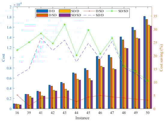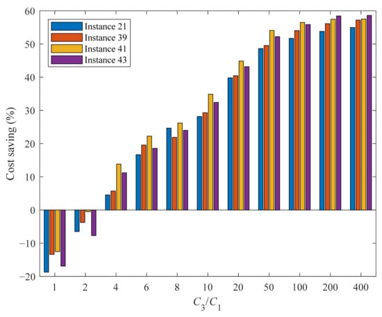 Figure 9 clearly illustrates the increase in cost savings as the ratio increased. However, when was less than 4, the values of cost savings were negative, which was contrary to our expectations. Through a careful comparison of solutions under two operation methods, it was found that although SD/SD could increase the solution space, it could also lead the GA to become stuck in a local optimum when the cost per unit waiting time approached or equaled the cost per unit of traveling time. When equaled or exceeded 4, SD/SD gradually exhibited its advantages in cost savings. When was 400, the average value of cost savings reached 57.08%. This intuitive phenomenon was a result of augmented flexibility endowed by the combination of Strip and Discharge modes. The truck could decide whether to wait for packing and unpacking operations depending on the specific circumstances, thus improving scheduling flexibility to reduce unnecessary truck waiting time and traveling time. The aforementioned observations permit the conclusion that if the total cost per unit of waiting time was significantly higher than the total cost per unit of transportation time, the combination of the Strip and Discharge modes emerged as the more advantageous alternative.