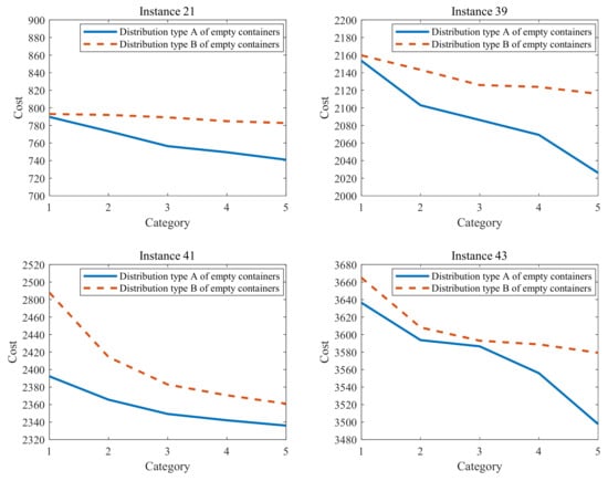 The results of four instances are shown in Table 11 and Figure 10. As expected, an increase in the total quantity of empty containers resulted in an obvious reduction in total costs. For example, with the change from category 1-A (1-B) to category 5-A (5-B), the cost of instance 21 decreased by 48.77 (10.33). It was also found that the distribution of empty containers was of great significance to the total cost. Without exception, distribution type A outperformed type B with the same number of empty containers in any instance. The essential reason for this phenomenon was as follows: providing additional empty containers at the depots allowed the truck to pick up these empty containers from a depot closer to the customers who needed them. This arrangement helped reduce the total cost by avoiding trucks waiting with some customers for full containers to be emptied. In conclusion, this finding implies that supplying more empty containers and a suitable distribution of empty containers to each depot can remarkably enhance the efficacy of truck scheduling when there is limited availability of empty containers.