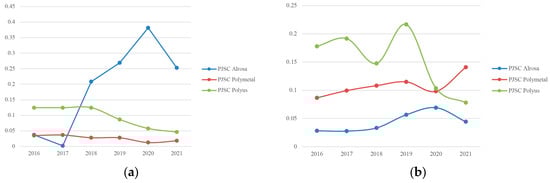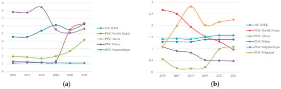 Similarly, a positive trend indicating a reduction in companies’ eco-intensity is evident in the operational activities of JSC SUEK and PJSC Norilsk Nickel. However, in the case of PJSC Polymetal, the rate of increase in the eco-intensity of air was 162.4%, and for waste, 2.4 times; meanwhile, the growth rate in sales revenue was 2.0 times over the analyzed period. Figure 3a shows the highest rate of increase in the eco-intensity of wastewater observed in the operational activities of PJSC Alrosa, which increased by 6.8 times. The increase in wastewater discharge is associated with measures to eliminate tailings of one of the beneficiation plants. Overall, eco-intensity indicators reflect the impact of all types of pollution or indicate a certain level of impact.