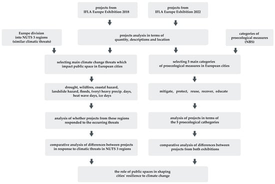 The data obtained from the first part of the study were verified in the context of local threats related to climate change. To this end, the geographic distribution of projects was juxtaposed with the delineation of Europe into NUTS 3 regions [20]. During the comparative analysis with data sourced from the Climate Risk Typology Map, only countries encompassed within its scope were taken into account. Leveraging information extracted from the exhibition [26,27], the projects were scrutinized for their incorporation of pro-environmental solutions, with particular emphasis placed on the adaptation of public spaces to climate change. Subsequently, an analysis of whether projects from specific regions took action to prevent particular threats faced by these urbanized areas was conducted. The results of the analysis are presented in the context of current challenges related to climate change in Europe. The scheme presenting the research methodology is shown below (Figure 1).
