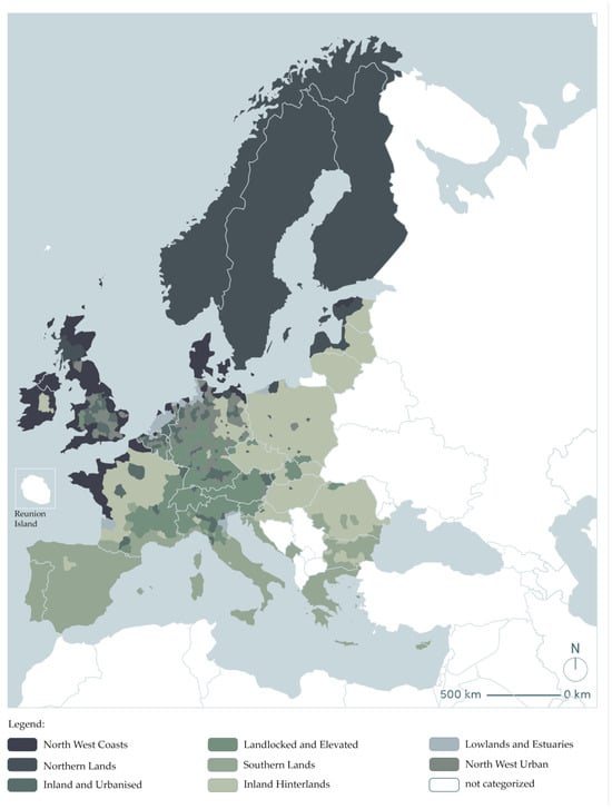 Based on information published by the European Environment Agency (EEA) in Report No. 12/2020—Urban Adaptation in Europe: How Cities and Towns Respond to Climate Change, we can note that the elements most affected by climate change are and will be the following: the environment, biodiversity, and land forested [4]. The main expected and current impacts of climate change depend on the region of Europe [5]. Threats that directly affect urbanized areas in the European Union are described in the European Climate Risk Typology [20]. The segmentation into areas in this list was developed according to the hierarchical system of dividing the economic territory of the European Union—NUTS. In this particular case, districts belonging to NUTS 3 were distinguished as areas with 150,000–800,000 inhabitants [28]. These regions are visible in the illustration below (Figure 2).