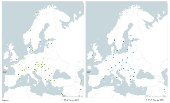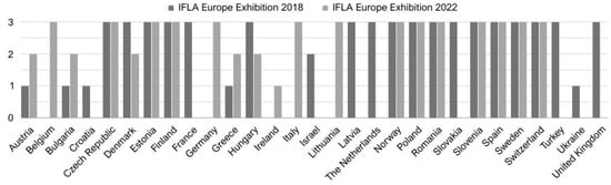 In the majority of instances, countries presented three examples of projects that had been created over the last 4 years preceding a given edition. This is the maximum amount that an association representing a given country in the IFLA EU can submit to the exhibition. In both editions, three projects were presented by, among others, the Czech Republic, Norway, Poland, and Spain. However, in some cases, fewer projects were presented. For instance, during the first edition, entitled “Landscape Architecture as a common ground 2018”, two projects were submitted by Israel, and one by Austria, Bulgaria, Croatia, Greece, and Ukraine. The second edition, entitled “Reconsidering Nature 2022”, presented two projects each from Austria and Greece, and only one from Ireland. A comprehensive overview is depicted in the bar chart below (Figure 3).