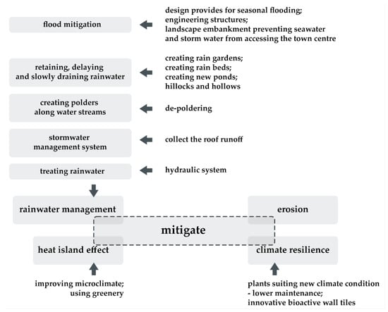 Climate change is one of the most painful environmental problems [1], exerting an escalating impact on both human societies and natural ecosystems [2]. Notably, over the last decade, a discernible intensification has been observed [3], marked by conspicuous alterations such as rising air temperatures, varying precipitation patterns, proliferation of extreme weather events, sea level elevation, floods, droughts, and wildfires. The factors mentioned above are progressively reshaping the landscape and everyday life of European citizens [4]. They constitute one of the most important design challenges today. The problem affects both the Mediterranean region and the Arctic areas in the northern part of the Old Continent [5], it affects both urbanized areas and rural areas. Cities, owing to their intricate physical and socio-economic characteristics, emerge as particularly susceptible to the vagaries of climate and weather phenomena. The extent of threats depends on topography, location, and the efficiency of urban resilience strategies [4].