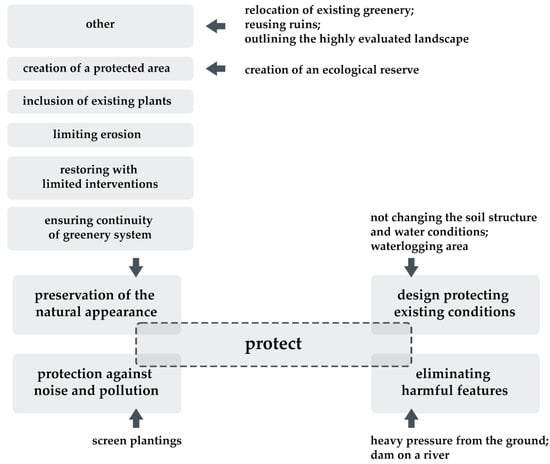 In contemporary nature conservation, protected areas are increasingly used as a tool for preserving biodiversity through an ecosystem approach (Figure 6). These areas hold significance not only for specialists in the field of ecology but also for broader societal groups [29]. For instance, the German project 22_DE_02, titled ‘Baumkirchen Mitte’, by mahl gebhard konzepte, exemplifies this approach by establishing a new ecological reserve within the designated area [27]. However, legal protection was not applied in every case. Consequently, the predominant action in this category involves safeguarding the existing natural features of green spaces. Another important factor is the inclusion of plant species already existing in a given place into the design concept. This was done, among others, in the project 18_EE_02, entitled ‘Reconstruction of Roosi Street’, by Landscape architects Mirko Traks et al. Protection of existing ecosystems can also be achieved through measures to combat erosion (18_FR_03; Parc Agricole de vernand—FABRIQUES Architectures Paysages et al., France) by making the area available using only delicate design interventions (18_TR_02; Terkos old water pumping station museum—DS Landscape & Trafo Architects, Turkey) and paying particular attention to maintaining the continuity of existing ecological corridors (18_DK_02; Vestre Fjordpark—GHB Landskabsarkitekter et al., Denmark) [26]. Finally, it is also worth emphasizing the importance of activities that eliminate factors negatively affecting the proper development of ecosystems and vegetation. This situation occurred in the 18_FI_03 project from Finland titled ‘The Tikkurila River Park’ by M. Hakari and Loci Landscape Architects Ltd., where a dam blocking the free migration of fish in the river was removed [27].