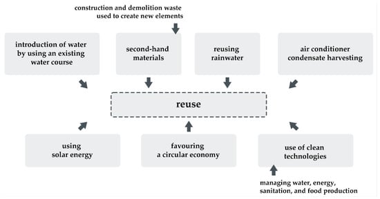 In alignment with the objectives outlined in the Paris Agreement of 2015, which aims to achieve climate neutrality in Europe by 2050, it is imperative to reduce greenhouse gas emissions to zero compared to 1990 levels [30]. Reducing the carbon footprint of architectural and urban investments is an important element of this strategy. The construction sector is responsible for approximately 38% of global carbon dioxide emissions [31]. To diminish emissions originating from construction materials, one approach involves utilizing recycled materials sourced from demolition activities (Figure 7). This measure was used in the Irish project 22_IE_01, entitled ‘Bridgefoot Street Park’, by Dermot Foley Landscape Architects [27]. An important aspect is also the reuse of rainwater, among other uses, for watering plants (22_IT_02; City Water Circle—OPEN 011—Alessandra Aires Landscape Architect et al.), or condensation from air conditioners (18_IL_02; A resilient and bio-enhanced urban oasis—Studio Urbanof Landscape architects, Israel). Furthermore, irrigation of green spaces can be augmented by leveraging existing watercourses, as illustrated in the project (18_CZ_02; Chateau City Park Pardubice—Tyršovy Sady—Studio: New Visit, Czech Republic) [26]. Contributing to the ethos of a circular economy, the Spanish project 22_ES_01, titled ‘Forest Path in the Cemetery of Roques Blanques, El Papiol’, by Batlleiroig Arquitectura, endeavors to minimize waste generation [27]. Additionally, the adoption of clean technologies, such as energy generated by photovoltaic panels, plays a pivotal role, as evidenced in project 18_LV_03; Jauna Teika (New Teika)—Multifunctional Complex—Landscape: ALPS Ltd.; Architecture: Tectum Ltd., Latvia [26].