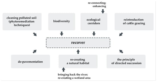 One of the trends visible in the projects analyzed was the restoration of previously lost ecosystems (Figure 8). A great example of this type of intervention is the Swiss river restoration project titled ‘Renaturation of the river Aire’, by Superpositions. These activities were described by the authors as follows: The project consists in a real “restoration” of the territory, since it reconstructs landscape features—ditches, hedges, groves, marshes — almost entirely disappeared, but clearly legible on the historical documents. In the area reserved for natural environments (approximately 80-metre strip along the canal), the intensively cultivated open lands are replaced by diversified environments that allow the creation of a true ecological corridor that encourages the networking of biotopes and the movement of small fauna [26]. However, it is worth remembering that these types of investments are long-term and it is not possible to fully restore their naturalness [32]. Notable examples of ecosystem restoration in representative projects also include river revitalization efforts (22_NO_03; Grorud Park—LINK Arkitektur—Landskap, Norway) [27]. Additionally, endeavors aimed at enhancing biodiversity within urban areas fall under this category, as exemplified by project 22_GR_02; ‘Biodiversity green roof in Athens’, by Katerina Gkoltsiou et al., located in Greece. Moreover this category includes strengthening, supplementing and rebuilding ecological corridors (18_GR_01; Blue and green corridors in Edessa—Dr.I.A.Tsalikidis et al., Greece), the phenomenon of directed succession (18_CZ_01; 4Courts Park—Studio: M&P architekti, Czech Republic), cleansing contaminated soil using phytoremediation techniques (18_NL_01; De Ceuvel—DELVA Landscape Architects et al., Netherlands) use of permeable surfaces (18_ES_01; Niel garden—miCHELE&mIQUEL, Spain) [26], or the currently quite frequently mentioned restoration of spaces which can also help in restoring the naturalness of highly urbanized environments.