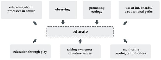 Many designers emphasize the educational aspect of their projects (Figure 9). This is achieved, among other ways, by raising users’ awareness of the values of natural areas in cities (22_PL_01; Educational pavilion with a recreational clearing on the banks of the Vistula River—eM4 Pracownia Architektury Brataniec, Poland) [27], or of biological processes occurring in the environment (18_LV_03; Jauna Teika (New Teika)—Multifunctional Complex—Landscape: ALPS Ltd. and Architecture: Tectum Ltd., Latvia) [26]. These efforts also include providing designated areas for nature observation (22_EE_01; Tondiraba Nature Park—H. Kalbergi et al., Estonia) [11], designing educational paths (22_LT_02; Melnragė Dunes Park—V. Pilkauskas et al., Lithuania) or education through play (22_RO_01; Forest Kindergarten—Poteca Studio, Romania). Furthermore, it is essential to monitor ecological indicators within specific areas and derive insights from such research to facilitate more effective adaptation to climate change (22_SE_03; Alnarp Landscape Laboratory—Department of Landscape Architecture, Planning and Management, Sweden) [27].