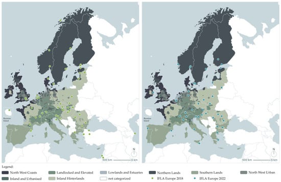 The research was conducted on the basis of representative examples of European projects submitted to two editions of the IFLA Europe Exhibition (2018 Landscape architecture as a common ground and 2022 Reconsidering Nature). The exhibition presents the best implementations of public spaces in the field of contemporary landscape architecture. These projects were selected by the member associations of IFLA Europe, which currently (March 2024) brings together teams from 34 countries [19]. Notably, the selection process does not adopt a competitive framework for identifying the best European works; rather, it provides an overview of achievements across individual countries. Through examination of these, the contemporary approach to spatial design was scrutinized and characterized in terms of prevalence and efficacy. Additionally, an analysis was conducted to ascertain the extent to which these actions answer climate change threats, employing the delineation of the EU into NUTS 3 areas (French Nomenclature des unités territoriales statistiques) [20]. Moreover, based on representative projects within the domain of landscape architecture, a paradigmatic approach for this still nascent profession was revisited.