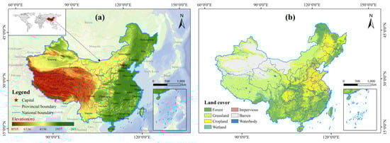 Location of China. (a) China’s geographical location in the world; (b) primary land cover types of China in 2022.