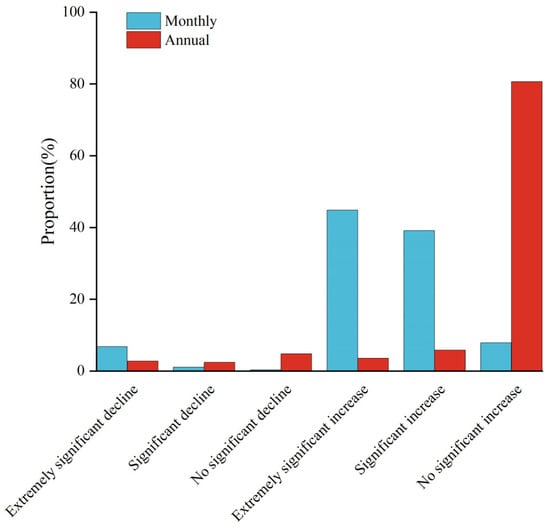 In this study, we analyzed the trends of annual and monthly average vegetation photosynthesis levels in China from 2001 to 2022 (Figure 2). The regions with increasing vegetation photosynthesis accounted for 90.01% and 91.78%, respectively. Both analyses revealed that vegetation photosynthesis levels in most areas exhibited an increasing trend, suggesting that the health of Chinese ecosystems is generally improving and that plants in these areas are adapting positively to environmental changes. According to the analysis of the trend in the annual average vegetation photosynthesis level, the majority of the areas did not exhibit a significant increase, accounting for 80.64%. In contrast, the trend analysis of the monthly average vegetation photosynthesis level revealed a clear increase in most regions, with regions displaying extremely significant increases accounting for 44.82% and 39.10%, respectively. Regardless of the spatial analysis results for both the annual and monthly data (Figure 3), a decrease in the vegetation photosynthesis level in China was predominantly observed in the western region. Although the area affected may not be extensive, this indicates that the vegetation ecosystems in these regions are still experiencing a degree of pressure. Consequently, further effective management is required to enhance the adaptability of vegetation to environmental changes and to ensure the stability and healthy development of the ecosystem.