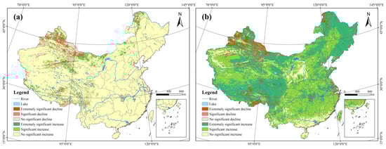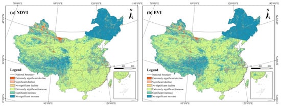 Spatial distribution of the MK test results for the monthly mean NDVI and EVI in China. (a) Spatial distribution of the MK test results for the monthly mean NDVI; (b) spatial distribution of the MK test results for the monthly mean EVI.