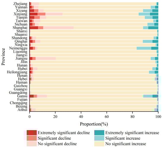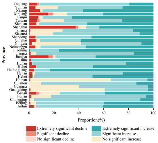 Area proportion of annual average vegetation photosynthesis level changing trends in Chinese provinces (autonomous regions and municipalities directly under the central government).