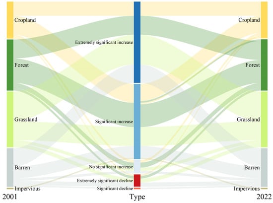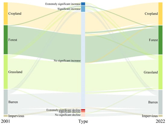 From 2001 to 2022, in regions experiencing extremely significant declines, the land use types with the highest annual average vegetation photosynthesis level change coverage degrees were barren land, grassland, and forest, with values of 0.4281, 0.2758, and 0.1553, respectively. For the monthly averages, the top three coverage degrees were 0.3088, 0.2910, and 0.1954 for the same land use types, respectively, again with no change in land use type. In regions of China with significant declines, the three land use types with the greatest changes in annual average vegetation photosynthesis were barren land, grassland, and forest, with values of 0.4295, 0.2625, and 0.1501, respectively, and there was no change in land use type. The monthly average coverage degrees were 0.7492, 0.0806, and 0.0370 for barren land, cropland, and grassland, respectively, and there was no change in land use type. In regions of China where no significant decline was observed, the three land use types with the greatest changes in annual average vegetation photosynthesis were barren land, grassland, and forest, with values of 0.5015, 0.1677, and 0.1197, respectively. The corresponding land use types had no change. For the monthly average vegetation photosynthesis level change coverage values, the top three were 0.7877, 0.0621, and 0.0232 for the same land use types, barren land, cropland, and forest, respectively, with no change in land use type. Considering that the proportion of areas with declining vegetation photosynthesis levels in China was not substantial, the regions experiencing a decrease in photosynthesis levels for the three types of vegetation were primarily found in barren land use types. This suggests that the Chinese government’s land and environmental protection policies need to give sufficient attention to barren land types.
