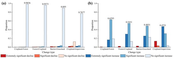 From 2001 to 2022, the top four LCC forms in China were cropland to forest, forest to cropland, barren land to grassland, and cropland to impervious land, with area proportions of 2.84%, 2.78%, 1.74%, and 1.67%, respectively (Figure 8). During the process of forest-to-cropland conversion, the change in the land use–annual average vegetation photosynthesis level exhibited the highest confidence value, 0.9573, yet the trend in the change in the vegetation photosynthesis level did not significantly increase. The land use–monthly average vegetation photosynthesis level change reached its highest confidence value at 0.5451, with a significant increase in the trend of the vegetation photosynthesis level. The strongest association between land use and the annual average vegetation photosynthesis level change was observed with a confidence value of 0.8950, which was characterized by no significant increase in the vegetation photosynthesis level during the conversion from barren land to grassland. The highest land use–monthly average vegetation photosynthesis level change yielded a confidence value of 0.4851, with a significant increasing trend. In the process of converting cropland to impervious land, the highest confidence value for the change in the land use–annual average vegetation photosynthesis level was 0.7677, with no significant increase in the vegetation photosynthesis level. Similarly, the land use–monthly average vegetation photosynthesis level change reached a confidence value of 0.4721, demonstrating an extremely significant increase in the vegetation photosynthesis level. The increasing trend of vegetation photosynthesis levels in regions where land use type conversions have occurred underscores the efficacy of China’s policies on forest conservation, desertification control, and soil and water conservation, among others. The confidence levels of the changes in land use–vegetation photosynthesis levels for the four transformation types are shown in Figure 9.