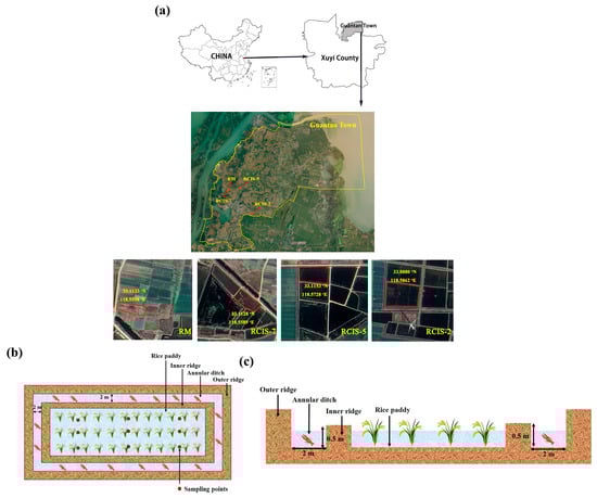(a) Locations of the soil sampling sites (Google images of the Earth) in this study. RM: rice monoculture; RCIS-7: 7-year RCIS; RCIS-5: 5-year RCIS; RCIS-2: 2-year RCIS; Schematic of field structure of RCIS: (b) top view, (c) section view.