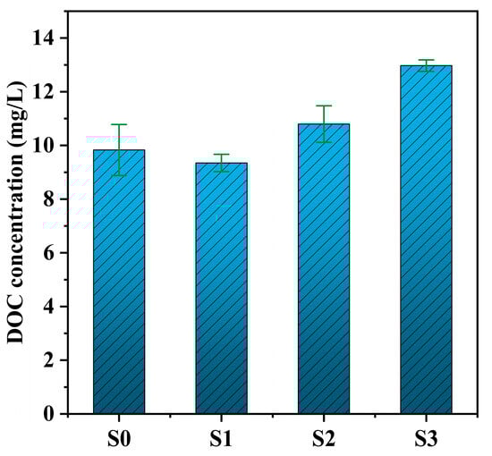 Gao et al. reported significant disparities in DOC contents within soils located in subtropical monsoon climate regions []. Given that Jiangsu Province is within this climatic zone, this study observed a peak DOC content at 86.01 mg/L. However, the DOC content in our study was lower compared to the findings of Gao et al. Li et al. explored DOM mineralization in subtropical rice soils and noted seasonal variations influencing DOC content, with the highest and lowest concentrations observed in November and July, respectively []. Therefore, the relatively lower DOC concentration in our study may be attributed to seasonal fluctuations affecting temperature, precipitation, microbial activity, and other relevant factors, particularly during the winter months [].