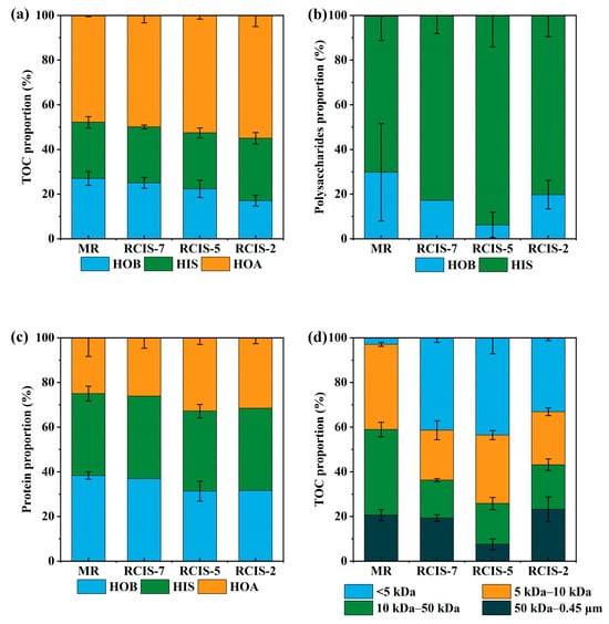 Hydrophobicity is a key physicochemical property of DOM []. The overall hydrophobicity and molecular weight distribution of DOM from the soils of RM and RCISs are depicted in Figure 3. The DOC proportions from different soils—HIS, HOA, and HOB—generally follow the order HOA > HIS > HOB (Figure 3a). Compared to RM, RCIS soil shows an initial increase followed by a decrease in HOA content over time, while HOB content initially decreases then increases. HIS content remains largely constant.