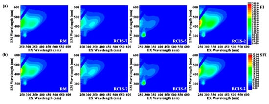 EEM fluorescence spectra of DOM from the soil of RM and different-term RCIS (a) FI, (b) SFI.