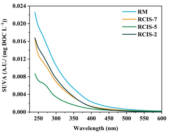 The fluorescence indices of RM and RCISs are summarized in Table 3. The variations in SUVA for RM and RCIS across the wavelength range of 240–600 nm are illustrated in Figure 5. The SUVA for all samples decreases with increasing wavelength, showcasing an absorption peak between 250 and 280 nm. Compared to RM, the SUVA for the RCIS initially decreases and then increases over the cultivation period. Specifically, the SUVA of sample RCIS-5 is significantly lower than that of RCIS-2 and RCIS-7, with RCIS-2 exhibiting slightly higher SUVA than RCIS-7.