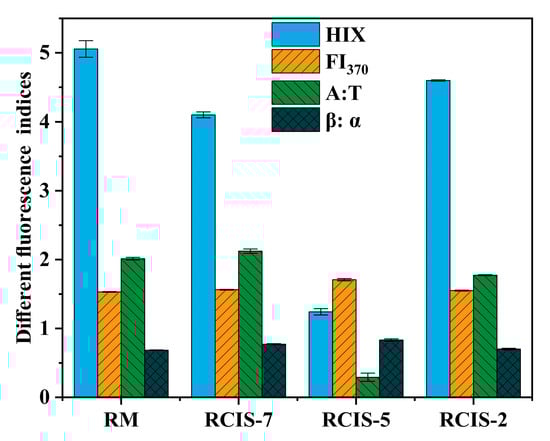 The changes in various fluorescence and absorbance indices (HIX, FI370, A:T, and β:α) for both RM and RCIS were examined further (Figure 7). HIX is strongly linked to the aromaticity of DOM and is inversely associated with its carbohydrate content []. Higher HIX values indicate either more condensed aromatic structures or greater conjugation in aliphatic chains. Among the four sample groups, RM recorded the highest HIX value at 5.05, while RCIS-5 had the lowest at 1.24. The HIX values for RCIS-7 and RCIS-2, at 4.10 and 4.59, respectively, were similar and markedly higher than that of RCIS-5. The values for RM, RCIS-7, and RCIS-2, which ranged from 4 to 6, suggest a weak humic character with recent contributions from autochthonous sources to DOM formation []. In contrast, the HIX value for RCIS-5 was below 4, pointing to a predominantly biological or aquatic bacterial origin of DOM []. Insights from previous studies on molecular weight distribution suggest that RCIS could enhance microbial abundance and diversity, facilitating the breakdown of high-molecular-weight humic substances. However, this did not lead to the anticipated significant increase in HIX values for RCIS compared to RM.