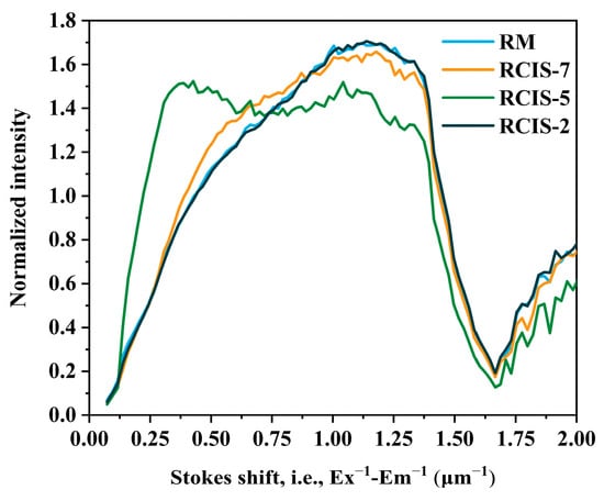 The Stokes shift is calculated from Ex−1 to Em−1 and reflects the energy relaxation loss during fluorescence []. The distribution of the Stokes shift in DOM samples varied across different management practices, as illustrated in Figure 8. The RM samples under RM showed a distinct peak at a Stokes shift of 1.07 μm−1. For RCIS, samples RCIS-7 and RCIS-2 displayed Stokes shift peaks similar in shape and value to RM, whereas the RCIS-5 sample had a reduced peak at 1.07 μm−1 and an increased fluorescence peak intensity at smaller Stokes shifts (0.27–0.62 μm−1). These variations in Stokes shift, corresponding with changes in the EEM spectra, indicate that shifts in hydrophobic and hydrophilic properties affect fluorescence characteristics. This is supported by the understanding that hydrophobic compounds generally exhibit higher Stokes shifts due to higher aromaticity and larger conjugated systems []. According to Xiao et al., it may be because hydrophilic compounds have a considerable number of carboxyl groups (as the main type of acidic groups), which can act as electron-withdrawing substituents to increase molecular hardness and reduce Stokes shift [,]. The alterations in the RCIS-5 sample’s Stokes shift spectrum can be explained by the consumption of hydrophobic organic acids, such as humic acids.