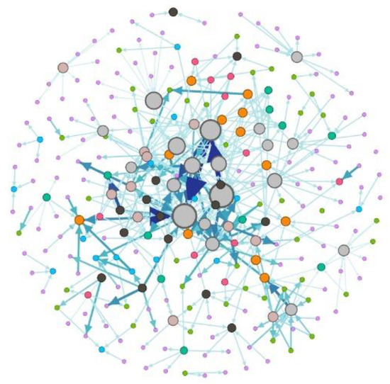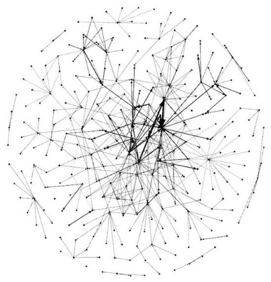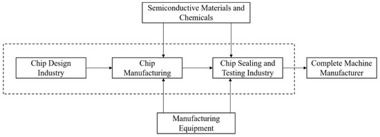 In the integrated circuit sector, a multitude of enterprises engage in a variety of relationships, such as transactions, equity participations, and investments, facilitated by regular interactions [30]. The network fundamentally forms connections grounded in the visible corporate affiliations of the enterprises as well as the concealed upstream–downstream relationships within the industry. Initially, significant enterprise data are harvested utilizing a web crawler plugin, followed by the determination of relationships according to their respective positions within the supply chain. Considering the unidirectional flow of the industrial chain, a company’s financial robustness partially mirrors its clout within the network. This study examines a directed and weighted enterprise network. The organization of enterprise relationships is meticulously undertaken, with this information subsequently transformed into a matrix format for enhanced analysis. Network relationships are visualized via Gephi (Gephi-0.10.1), facilitating the generation of an electronic component enterprise network diagram. The detailed diagram of the industrial chain is presented in Figure 1.