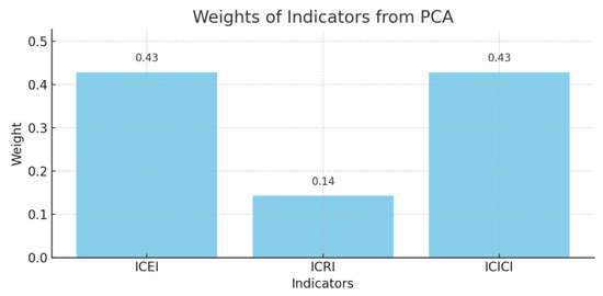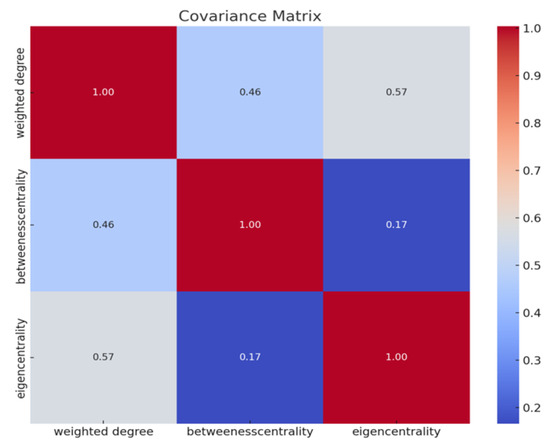 By performing eigenvalue decomposition on the covariance matrix, we can determine the principal components and their associated eigenvalues. This process allows us to understand the underlying structure of the data and the contribution of each principal component to the overall variance. The weights obtained from the first principal component were normalized to ensure that their aggregate equals one, thus facilitating an intuitive representation of the relative significance of each indicator within the comprehensive index. Figure 4 illustrates the PCA covariance matrix, which helps in understanding the underlying structure of the data and the principal components that contribute most significantly to the variance.