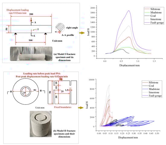 The mechanical parameters of the rock matrix were obtained according to the literature [37]. The parameters of a tension and shear mode fracture were obtained based on experiments of three-point bending and punch-through shear under loading and unloading conditions (Table 1 and Table 2). Shear friction parameters of the structural plane were obtained with the direct shear test. According to the mining depth of the Yushupo Coal Mine, the normal stress (σn) values of 1, 6, and 7 MPa were determined, and the shear friction parameters were obtained for different σn.