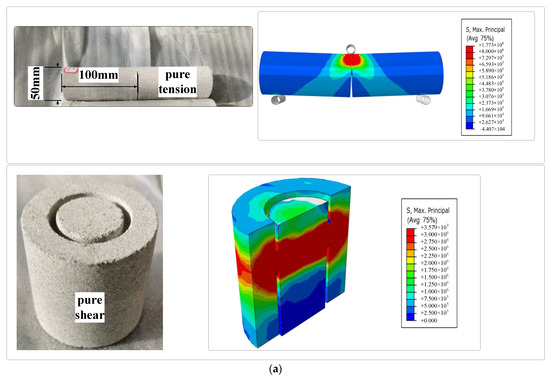 The mixed fracture constitutive equations can be verified by comparing the experimental and simulation results. According to the size and boundary conditions of the specimen in the experiments (Figure 1a,b), the numerical model was established (Figure 2a). The displacement loading rate is 0.02 mm/min. Cohesive elements were arranged at the prefabricated crack, and solid elements were arranged at the remaining positions. The mechanical properties of elements are shown in Equations (1)–(10), and the mechanical parameters are shown in Table 1. In the table, ρ is the density of the coal matrix, and parameters such as DS, Sp, σr, and Sr are all functions of the normal stress σn and the structural surface roughness coefficient JRC [38], and their values are obtained based on the experiment shown in Figure 1 The remaining parameters are explained in Section 2.