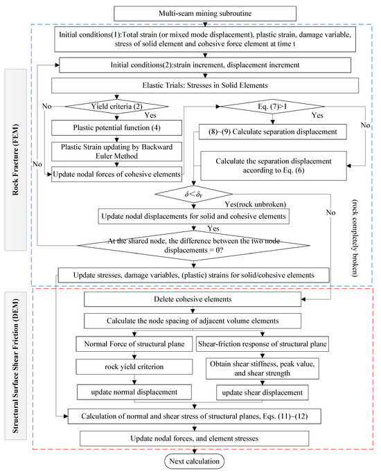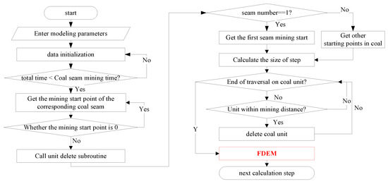 The above-mentioned FDEM program cannot automatically model the process of “coal seam mining, entity, and cohesive element deletion”. To achieve the above purpose, the VUSDFLD subroutine was compiled based on FORTRAN to model the continuous mining of multiple coal seams. The execution flow chart of the algorithm is shown Figure 4 below.