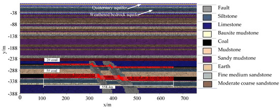 In order to study the evolution law of water-conducting fractures in overburden strata in conditions of extra-thick multi-coal seams and faults, a numerical calculation model as shown in Figure 5 was established according to the engineering geological conditions of Yushupo Coal Mine. Considering the high nonlinearity of the constitutive equations, the size of the model was controlled to be x = 760 m (length) and y = 388 m (height). Normal constraints were applied at the left and right boundaries, bottom boundaries, and front and rear boundaries of the model, and self-weight loads were set in the y-axis direction. Intact coal rock blocks were represented by hexahedral solid elements, corresponding to the elastoplastic constitutive model. The potential fracture surfaces of the rock mass were represented by cohesive elements, corresponding to the fracture constitutive model. Once rock mass was completely fractured, the structural plane formed a contact pair, where the given interaction was constitutive of discrete rock masses. The rock mechanical parameters are shown in Table 1. The two red areas in the model are working faces of 2# and 5# coal seams, with a mining length of 558.4 m. Starting 100 m from the left boundary of the model, Coal Seam No. 2 is mined from left to right at a rate of 5 m per day, continuing until mining ends 100 m from the right boundary of the model. After completing the mining of Coal Seam No. 2, Coal Seam No. 5 is mined in the same manner.