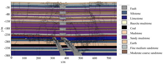 The distribution of natural structural planes in the surrounding rock is in the form of Voronoi polyhedra [39], and the spacing is determined as follows: Considering the periodic collapse step distance of the sandy mudstone roof in the No. 5 coal working face and the tensile strength ratios of various rocks to sandy mudstone, the average spacing of natural structural planes in different rock layers along the working face advancement direction is determined to be 25.7 m for limestone, 15.2 m for sandy mudstone, 17.8 m for sandstone, 11.2 m for mudstone, and 1.5 m for fault zones. Solid elements are divided between natural structural planes, with the boundaries of these elements serving as potential fracture surfaces. The spacing of these potential fracture surfaces is determined based on the average core length ratios of various rocks, taking into account computational costs. The determined spacings are 6.1 m for limestone, 4.8 m for sandy mudstone, 5.5 m for sandstone, 4 m for mudstone, and 0.6 m for fault zones.