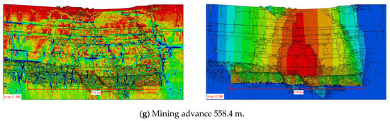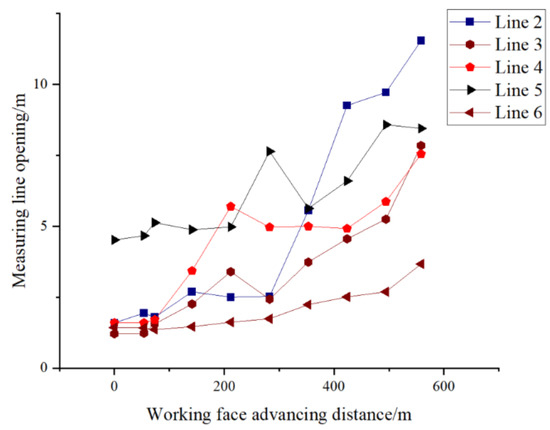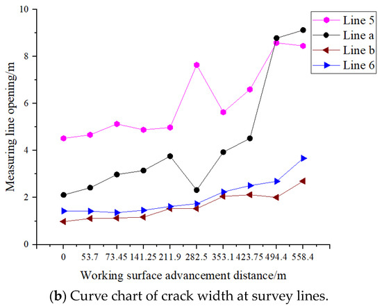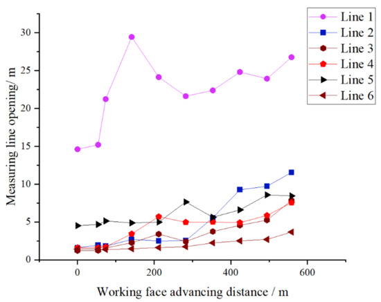 It can be seen from Figure 7 and Figure 8 that the opening of the water-conducting fractures at measuring lines 1 to 5 was characterized by a fluctuating trend with the working face advanced, showing an initial increase, followed by a decline, and finally another increase. Specifically, the opening in survey line 1 increased from 14.61 m (1.6 m from survey line 2) to 29.45 m (2.69 m), then decreased to 22.39 m (2.53 m), and finally increased to 26.77 m (11.55 m). As shown in Figure 9, when the working face advanced to 53.7 m, the roof fractured for the first time and began to collapse. At this time, the rock formation was subjected to low stress and showed a slight growth trend. When the working face advanced to 73.45 m, the roof fractured completely and collapsed, and the goaf was filled with discrete and fractured rock blocks, causing periodic pressure. The width of the water-conducting fissure changed greatly and rapidly increased to 21.24 m (survey line 1). At the same time, the working face advanced to 141.25 m. After survey line 1 reached its peak at 29.45 m, the mining stress gradually stabilized as the working face advanced to 282.5 m, and the rock strata showed a general downward trend. At this time, the width of the fissure dropped to 21.62 m. When the working face advanced to 558.4 m, due to the large mining span, the roof collapsed and subsided severely, and the cracks increased in width.